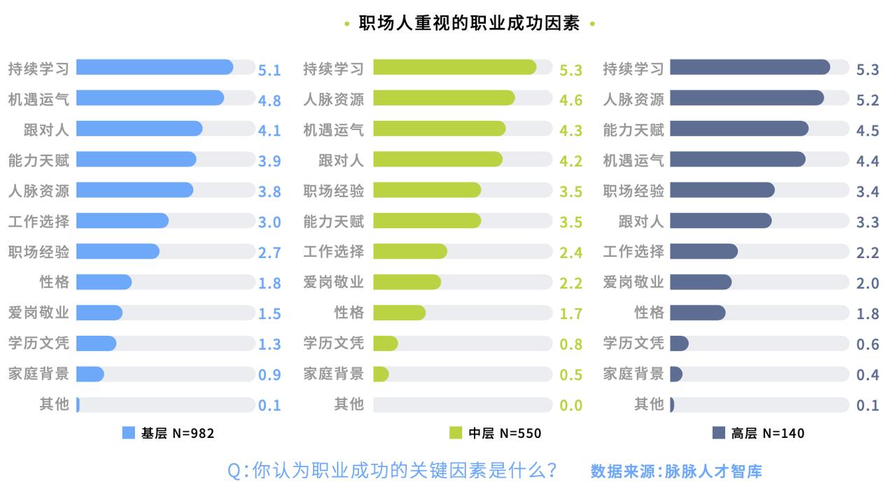 脉脉人才智库的人才吸引力报告调研结果显示,对于职业成功的因素,基层职场人把“跟对人”的重要性排在“能力天赋”之上。相比高层管理者,基层职场人把这一因素看得更重要。