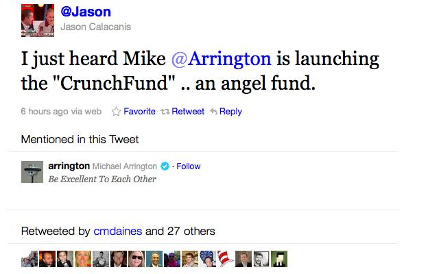 消息称TechCrunch创始人Michael Arrington将要启动自己的天使投资基金投资创业公司,基金名字延用TechCrunch一贯的作风 - CrunchFund。
