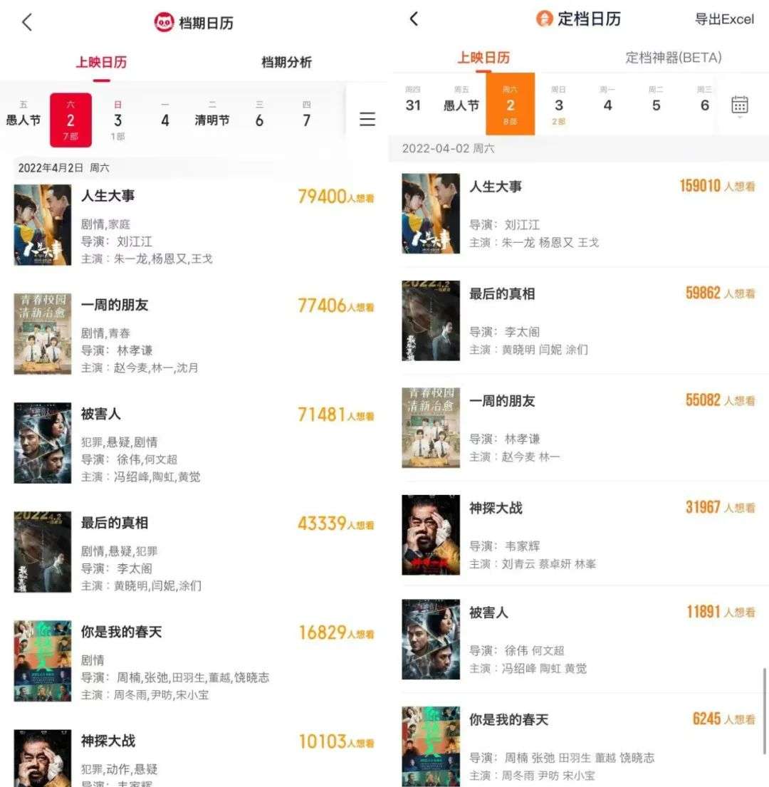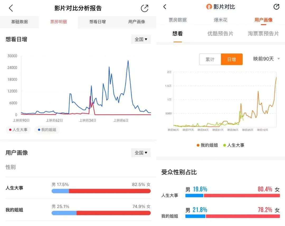 值得一提的是,《人生大事》的这一宣传模式、节奏,与去年同期上映的联瑞作品《我的姐姐》颇为相似。不过从效果来看,《人生大事》在猫、淘两平台的想看日增均落后于《我的姐姐》,在宣传效果上尚不及《姐姐》。