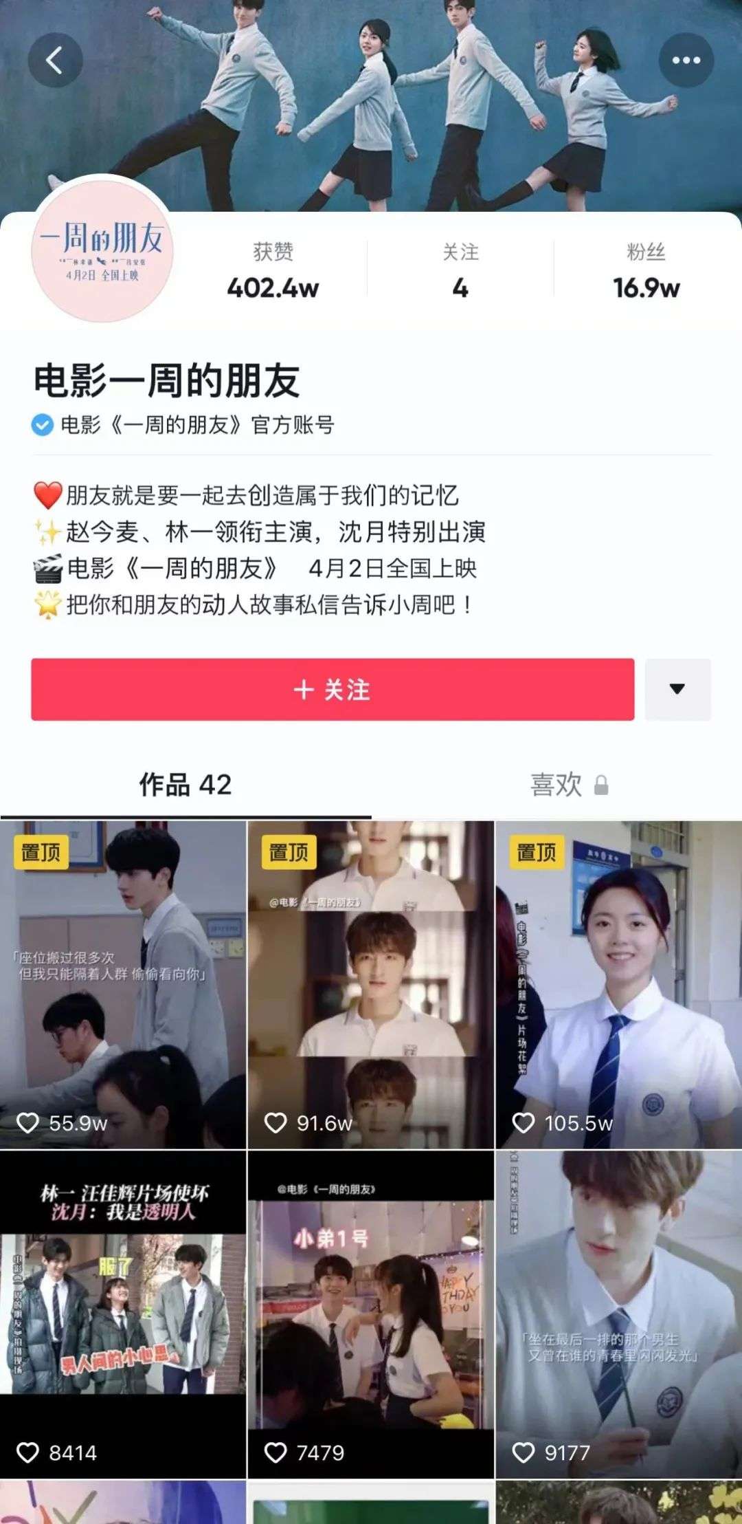 短视频方面,目前《被害人》《最后的真相》均未开始宣传动作。而在1月29日官宣定档后便开始稳定更新物料的《一周的朋友》目前在抖音平台热度最高,以官抖的402.4w获赞和16.9w粉丝领跑档期。