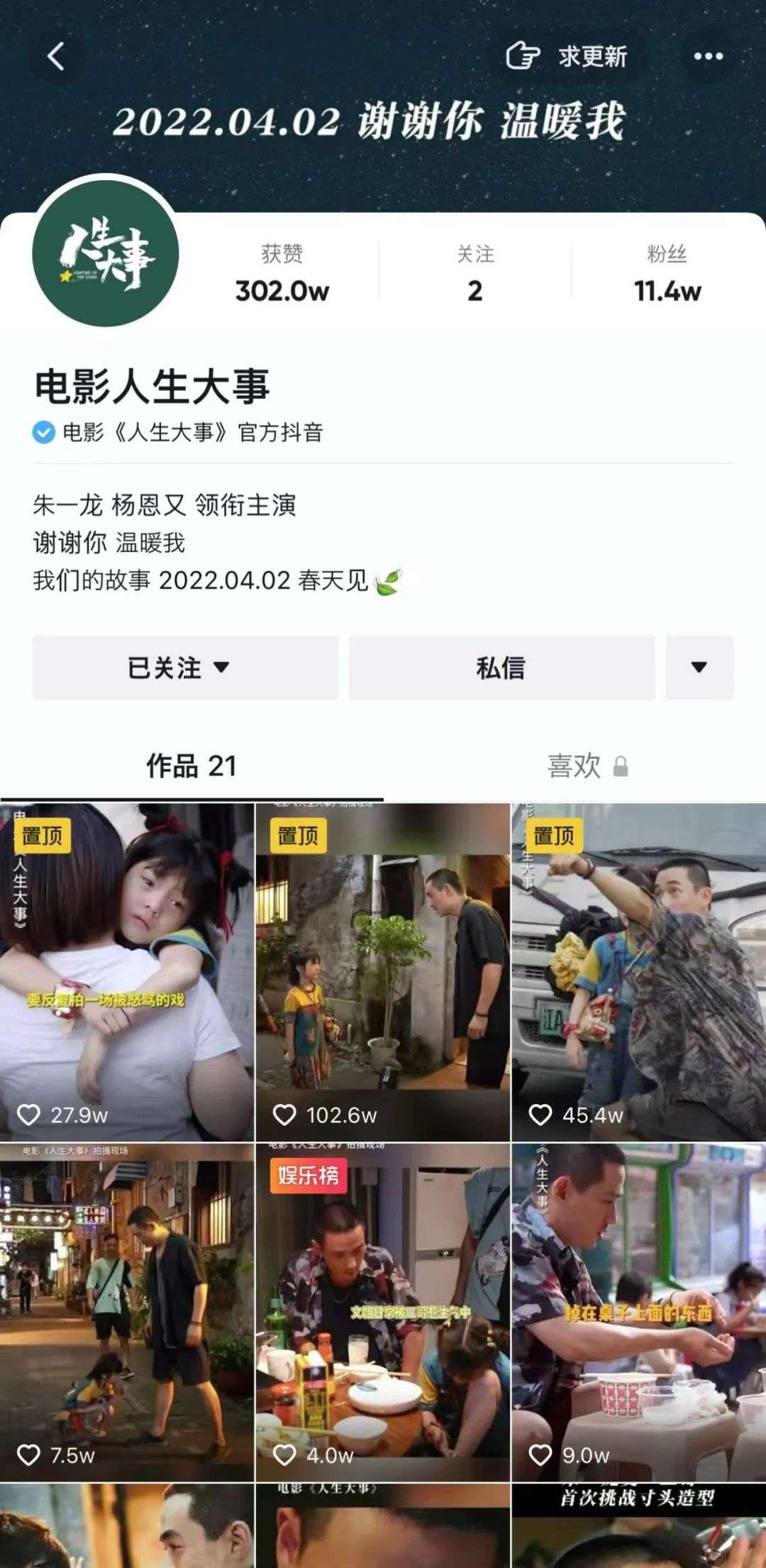 想看数据最高的《人生大事》也在3月1日发布一则预告和一组剧照后正式开始密集宣传动作,以官抖的302w获赞和11.4w粉丝紧随其后。