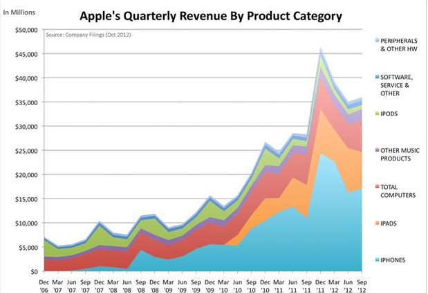 2012年,iPod的季度销售额已经不到10亿美元,只占据苹果整体销售额的2.3%,2/3的销售额都来自于iPhone和iPad。
