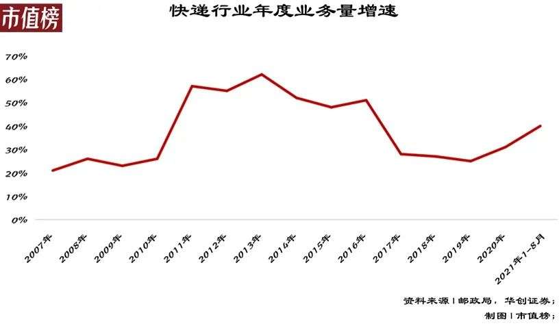 2011-2016年,在移动互联网+电商的双重冲击下,快递行业每年的业务量增速达到50%-60%,年均件量超过百亿件。