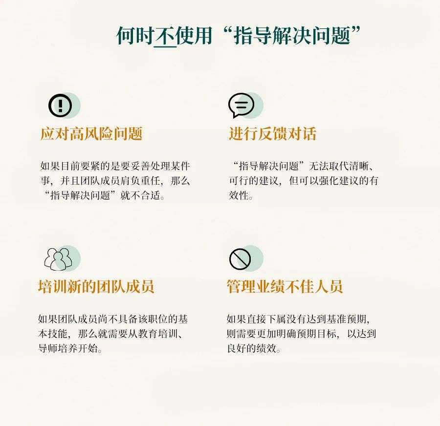 • 需要处理紧迫且风险较高的难题。如果目前要紧的是要妥善处理某件事,并且团队成员肩负重任,那么“指导解决问题”就不合适。你需要迅速介入,快速确定的方向。团队成员可以跟进你的指示,观察并学习你是如何处理紧急情况的。