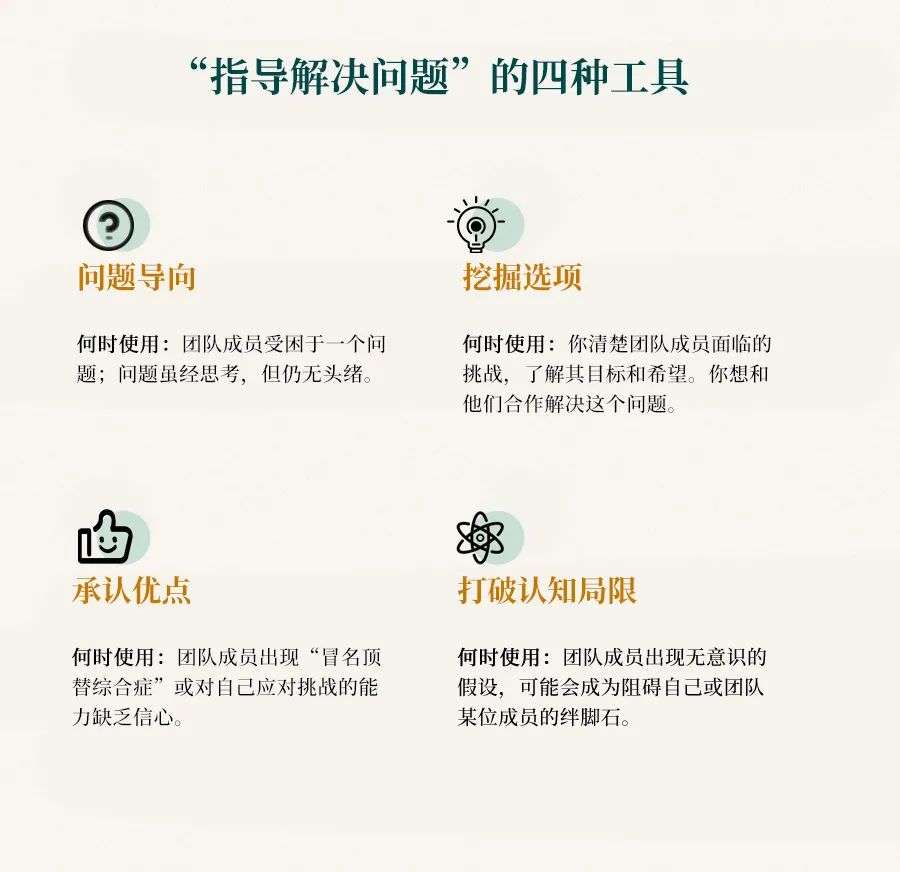 但是,你可能没有直接下属了解背景,也没有他们丰富的想法。 “指导解决问题式”方法不是立即建议要做什么,而是让团队成员能够自行克服挑战。