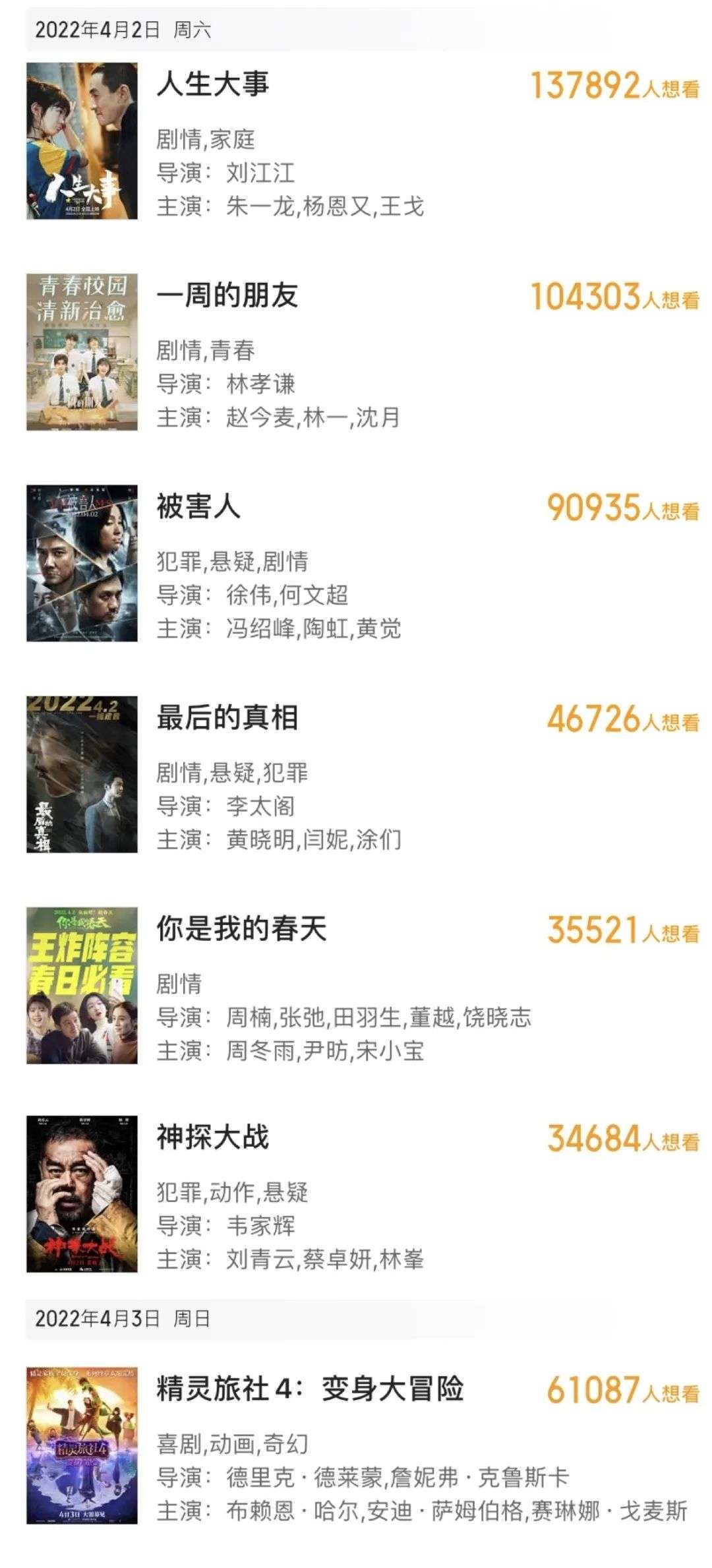 但硬币的另一面,如若疫情在3月底前得不到有效控制,清明档的观影人次势必会有所下降,再加上清明档的档期时长本就短暂,而《人生大事》目前的想看人数虽处于档期首位,但与排在第二位的《一周的朋友》并没有拉开绝对差距,业内目前给出的预测票房基本也都在2—3亿,同样的还有《人生的春天》《神探大战》《精灵旅社4:变身大冒险》。