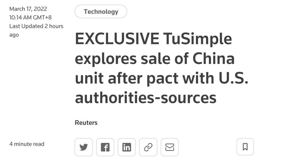就在今天,路透社报道称自动驾驶卡车初创公司图森未来正准备出售其在中国的业务,以专注美国市场。