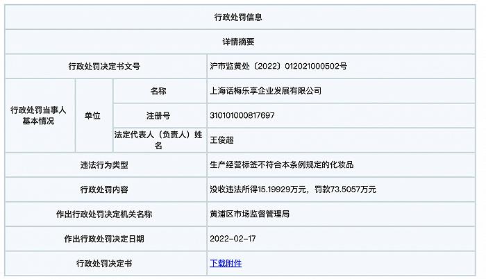 近日,上海市市场监督管理局官网显示,上海话梅乐享企业发展有限公司(以下简称「HARMAY话梅」)因「生产经营标签不符合本条例规定的化妆品」,被没收违法所得15.2万元,并处以罚款73.51万元,共计罚没88.7万余元。