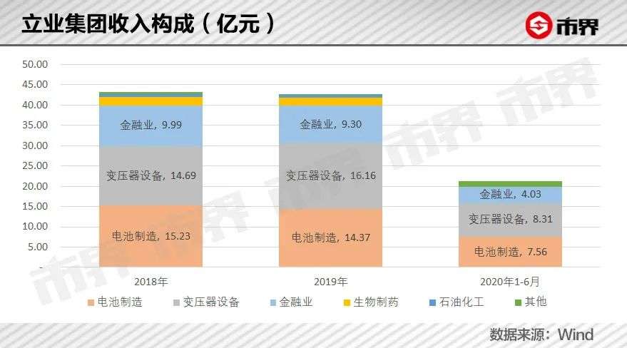 从收入构成来看,包括变压器设备、电池制造和金融在内的三大业务板块,是立业集团的主要营收来源,2019年分别带来收入16.16亿元、14.37亿元和9.3亿元,另有石油化工和生物制药,分别贡献1.94亿元和0.78亿元收入,合计77.94%的营收都来自生产制造业务。