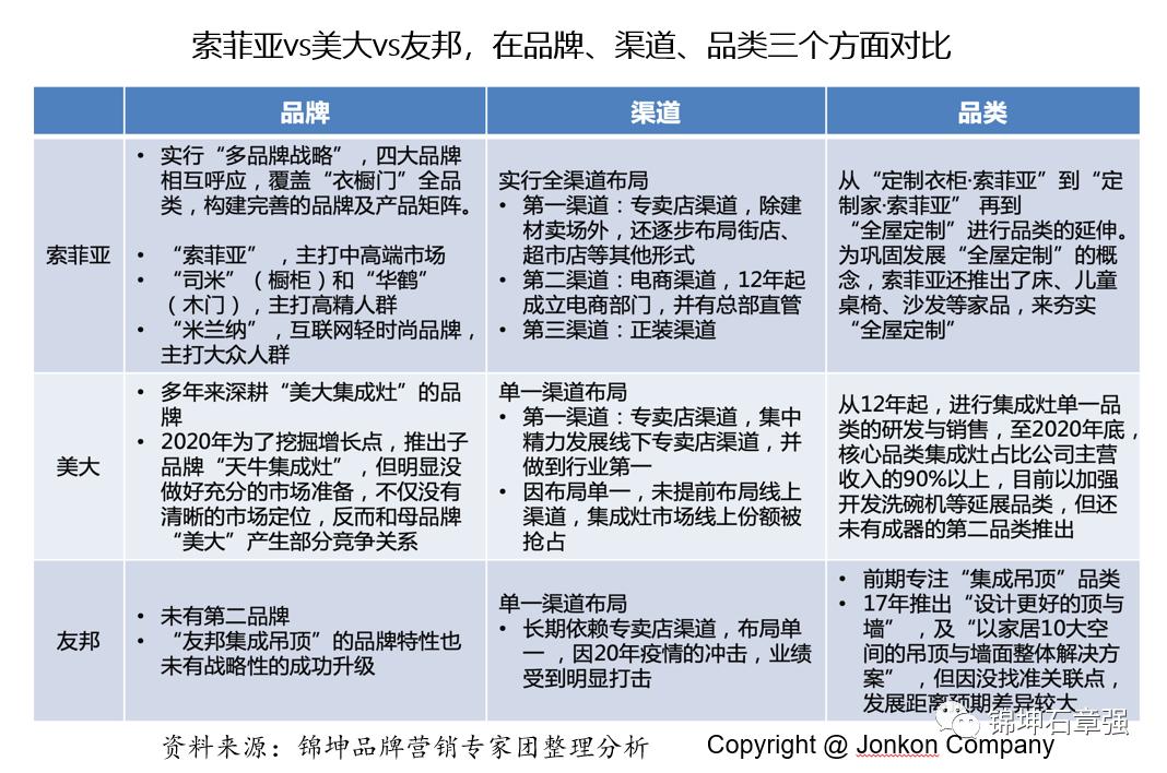 最后是品类方面。索菲亚从衣柜到厨柜到木门再到全屋定制,可谓一步一个脚印的进行品类的拓展,并找准时机切入市场,夯实全品类的布局;美大目前还吃着集成灶的红利,不过第二品类的布局略明显缓慢,至今没什么水花;友邦也推出了品类的自我延展,从顶延伸到墙,不过因没有做好合理的品类拓展规划和战略的布局,再加上顶和墙的品类没有有效的细分化和差异化,并没能在市场有可观的反响。