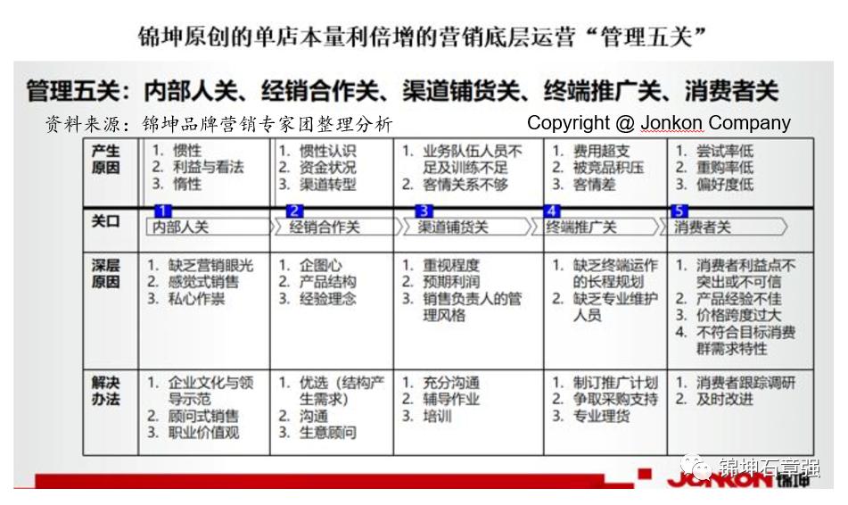 说到渠道,很多企业能想到的就是终端管理,但其实营销的管理远不是点状的管理,而是一条从厂商到消费者、从内部到外部的链状管理,需要做好内部人关、经销合作关、渠道铺货关、终端推广关、消费者关等“五关管理”。只有做好每一关的管理,协调好内部人关、打通经销和渠道关、营造好终端推广关,贴近消费者关,才能畅销长销高价销。