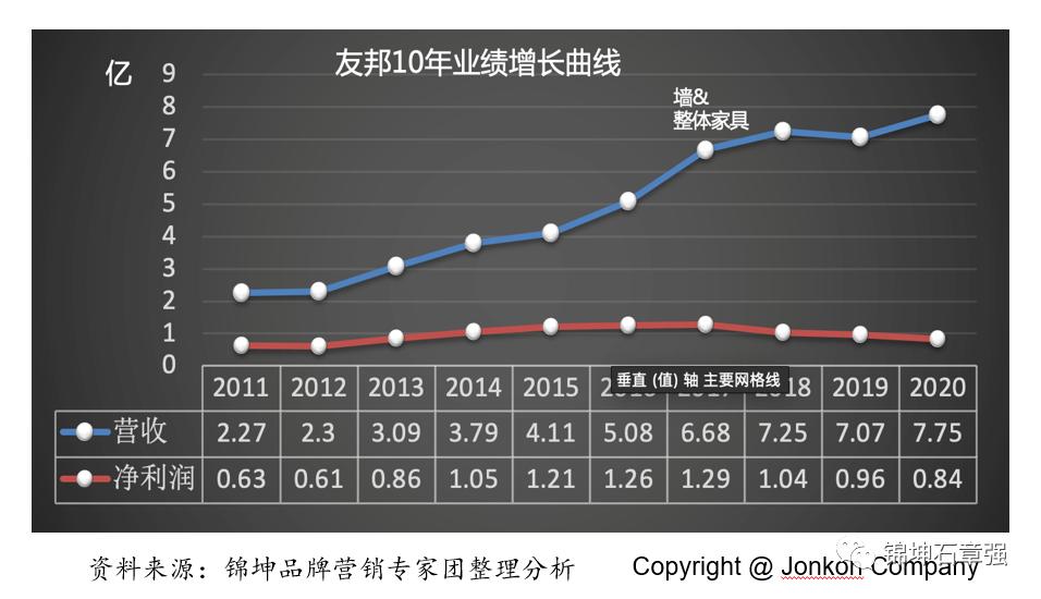 2017年,在经历了3年业绩在5亿徘徊不前的友邦,决定开拓新品类,提出“设计更好的顶与墙”等口号,并确立了“以家居10大空间的吊顶与墙面整体解决方案”为开发方向,但是这两块的业务拓展距离预期差距较大,并没有形成明显的业务增长。