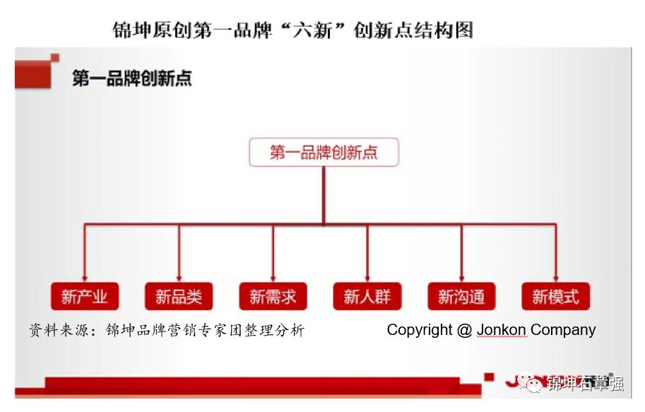 套用锦坤的第一品牌“六新”创新点结构图,我们发现能抓住新产业、新品类、新需求、新人群、新沟通、新模式这六新关键词,品类的扩充和品牌的打造就可以事半功倍。