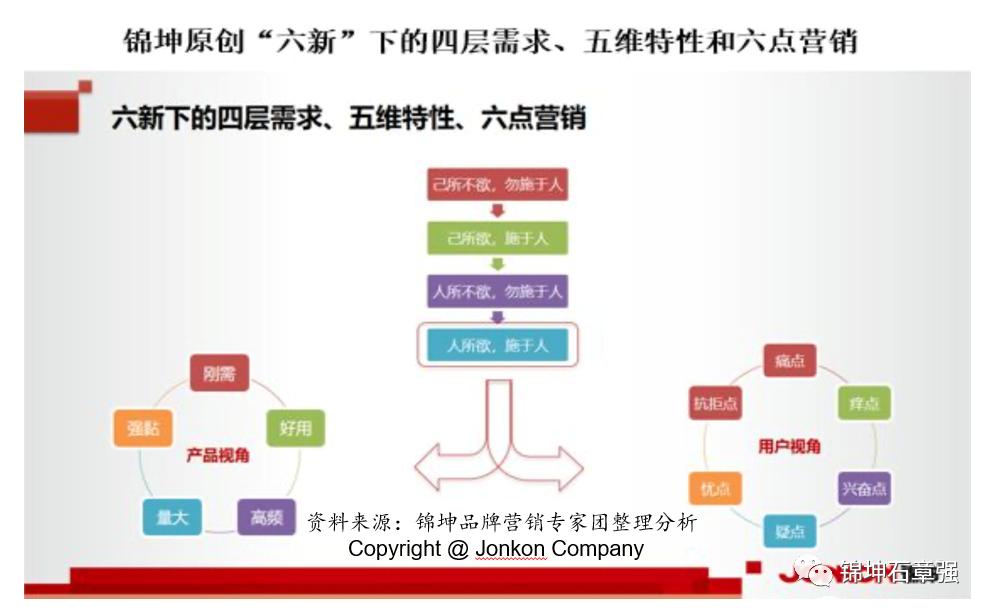 同样的,这六新也有落地的逻辑。第一品牌在做“六新创新”的时候要把握好“四层需求”、“五维特性”、“六点营销”,才能真正找到空白点、创新点和差异点,否则就容易出师未捷身先死。