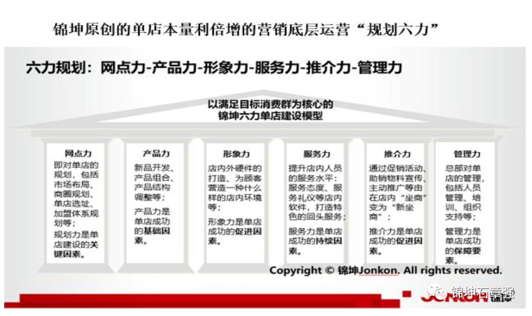 而围绕终端,锦坤认为需要做好规划力、产品力、形象力、服务力、推介力和管理力的“六力体系”工作。“六力”是一个相对静止的、横向的概念体系。它是从门店从市场发展规划到门店选址、供应商筛选模型到门店的形象、管理和服务操作甚至话术规范的统称。