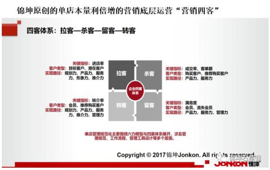 通过对三棵树、圣象、欧派的渠道创新之路进行复盘,我们不难发现,渠道的创新离不开营销、管理与规划。根据锦坤独创的“四客五关六力”的营销底层运营方法论,或许更好理解。