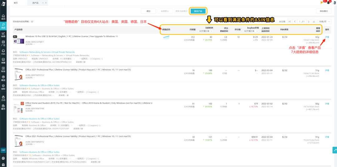 查询结果会展示包含ASIN的7种详细信息:销量趋势、历史趋势、产品信息、销量&BSR、评分、BuyBox价格、List价格。目前仅有美国、英国、德国、日本4个站点可查看近30天和近一年的销量趋势的查询,其他站点会在后续更新中推出,请到时留意公告。