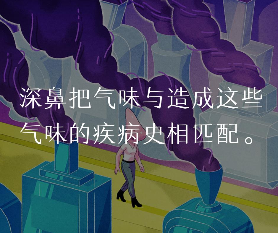 现在是2050年,你该做每月一次的例行体检了。时代变了,你终于不再需要忍受五官科检查、静脉采血,再花费一周的时间来等待验血结果。取而代之的是,护士笑脸相迎满脸笑意地对你说:“现在,医生要闻你了。”然后你被领进与一台巨大计算机相连的密封舱。当你在里面放松休息时,从你的鼻腔和皮肤散发出的易挥发性气味分子,会缓缓地飘进一台精密的人工智能仪,俗称深鼻(Deep Nose)。屏幕后的巨型电脑开始分析这些分子,将它们与已有的庞大嗅觉数据库进行比较。一旦深鼻得到了足够多的气味,它就会将你的气味和那些因系统性疾病而产生的气味进行匹配,并生成一份健康报告。最后,你的私人医生将与你一起查看结果,并规划治疗或调整用药。