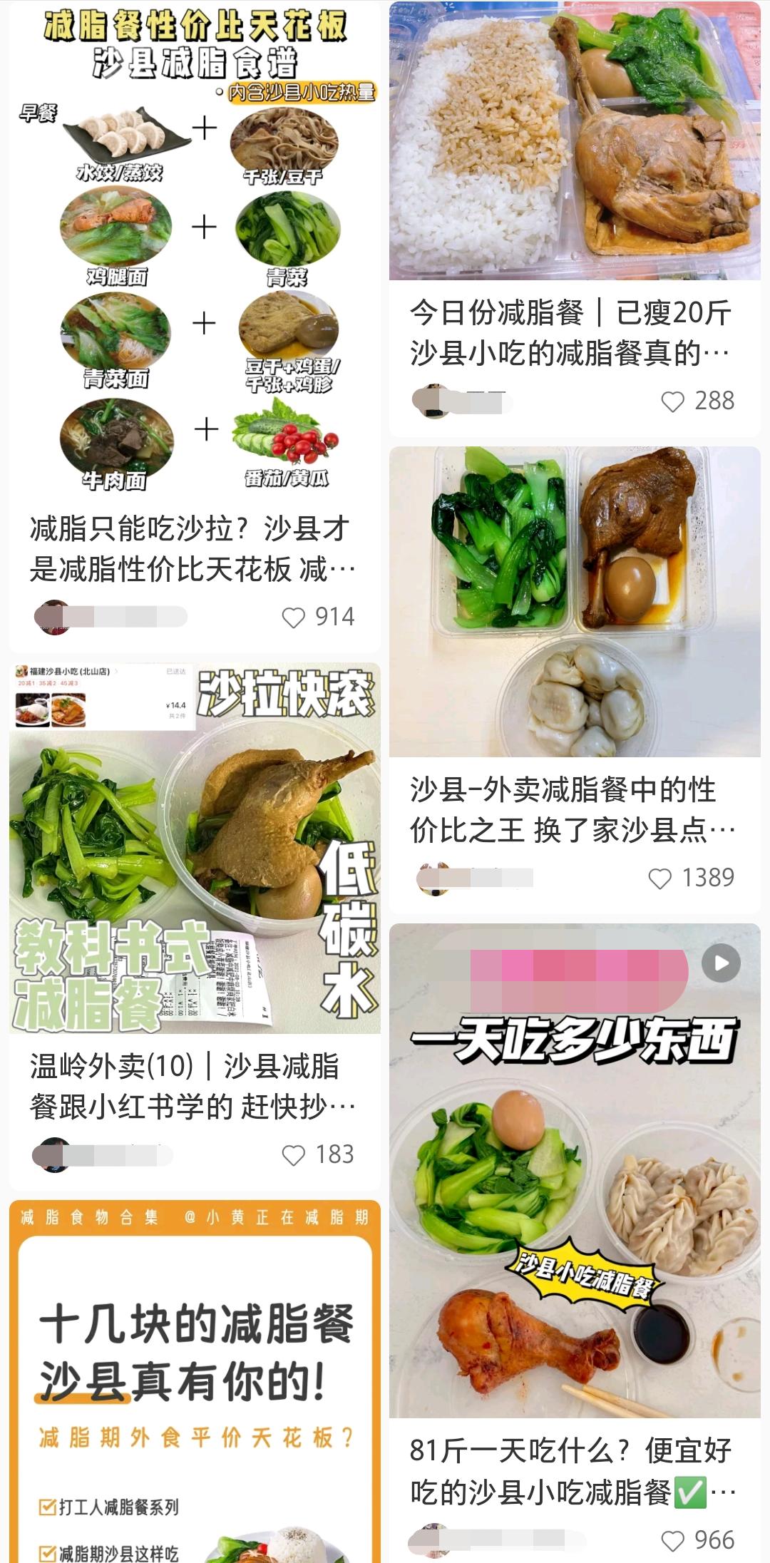 在某书软件上,以「沙县」一词进行搜索:5W+ 篇笔记涵盖了「低脂吃法」「500kcal攻略」「减肥餐食谱」等各个方面。