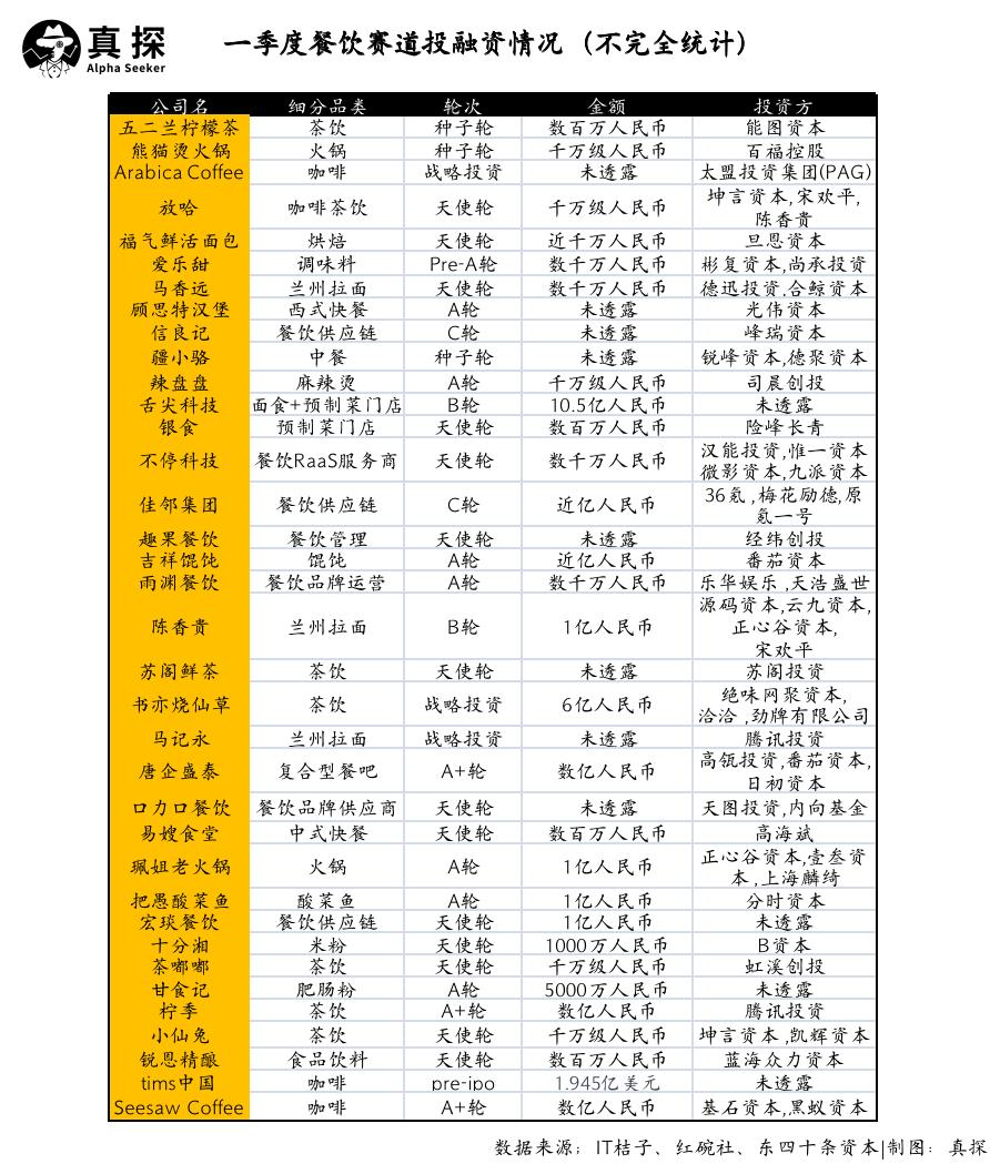 结合IT桔子、红碗社、东四十条资本的信息,一季度食品饮料赛道共有28起融资事件,仅次于餐饮赛道。