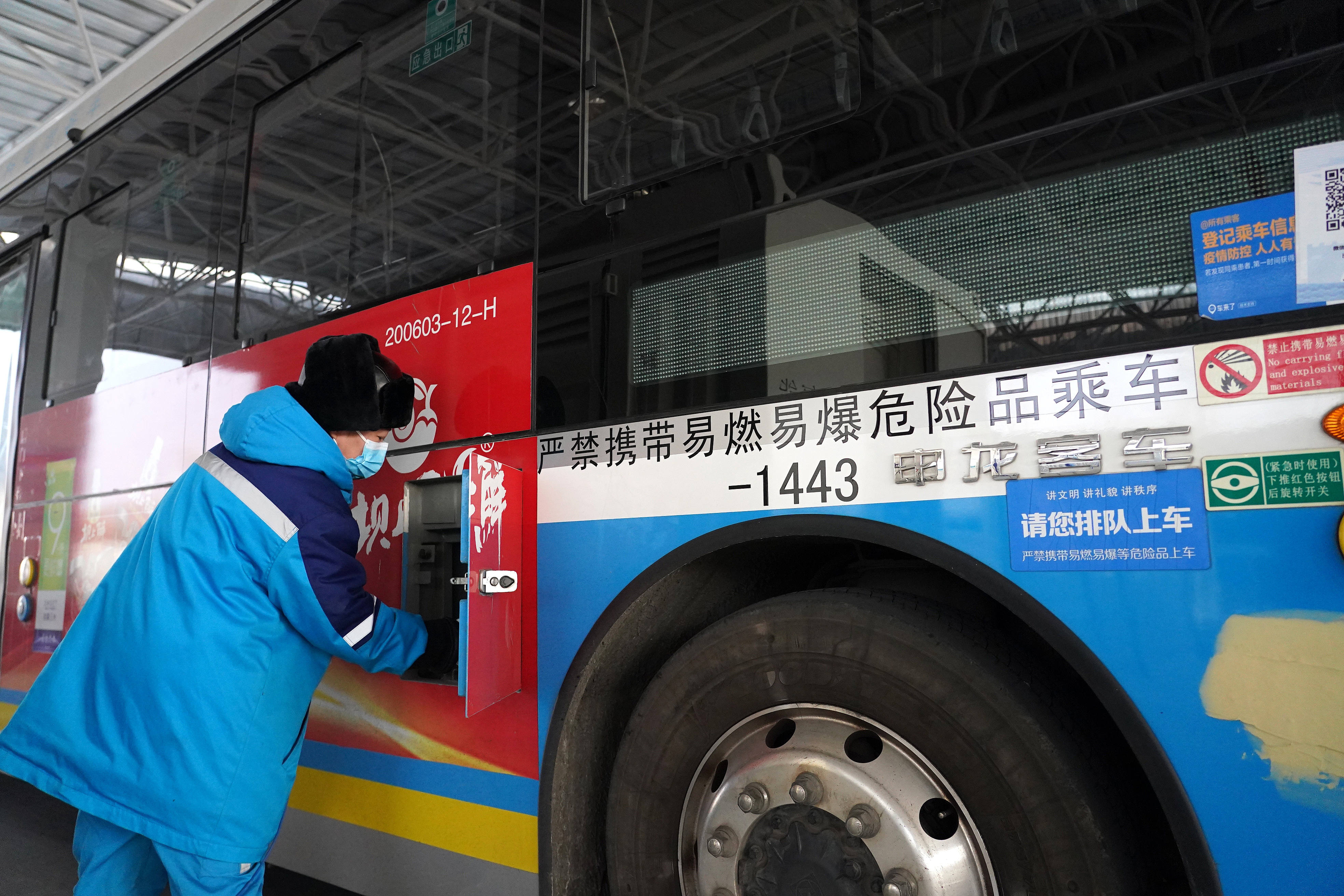 河北张家口:工作人员在为冬奥接驳车辆加氢。图片来源:视觉中国