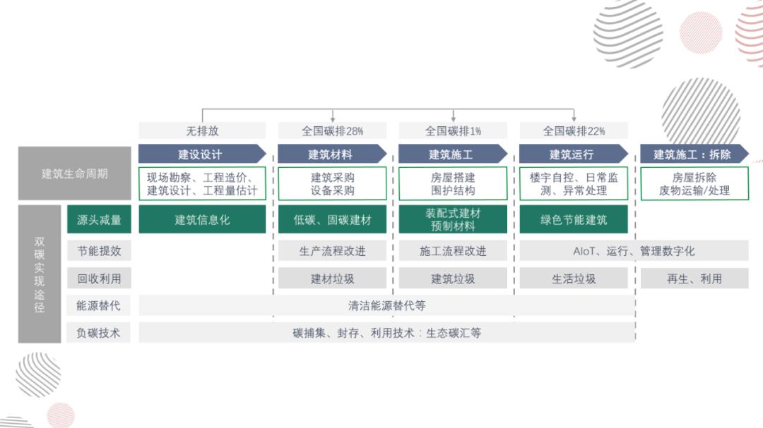 过去一年,在双碳目标的背景下,高能耗、高排放的房地产行业迎来了一场绿色大考。建筑行业是实现碳中和的重要场景,根据中国建筑节能协会发布的《中国建筑能耗研究报告(2020)》,2018年全国建筑全过程碳排放总量49.3亿吨,占全国碳排放比重的51.3%,其中建筑生产阶段碳排放27.3亿吨,建筑运行阶段21.1亿吨。未来,建筑领域全产业链将发生巨大变革,减碳技术及材料的大范围推广也将衍生出新的投资机会。