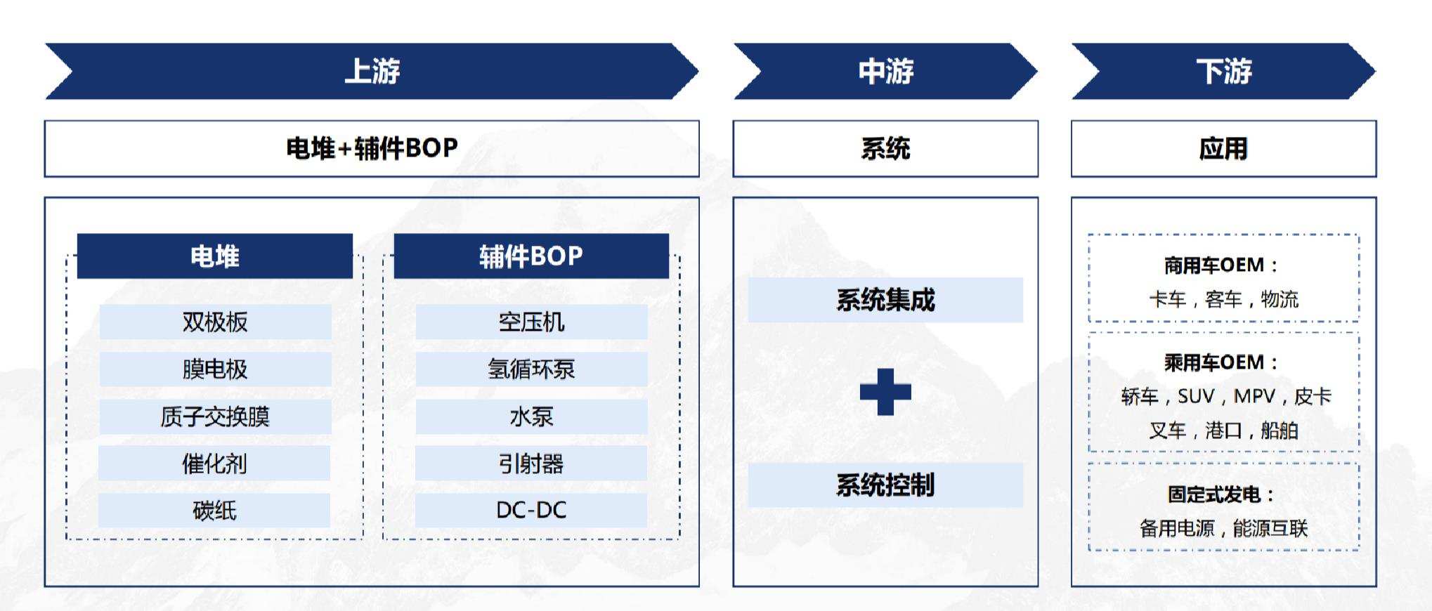 氢燃料电池发动机产业链的上游可以分为,电堆厂商和辅件BOP厂商;中游则是负责机械集成和部分控制的系统厂商。
