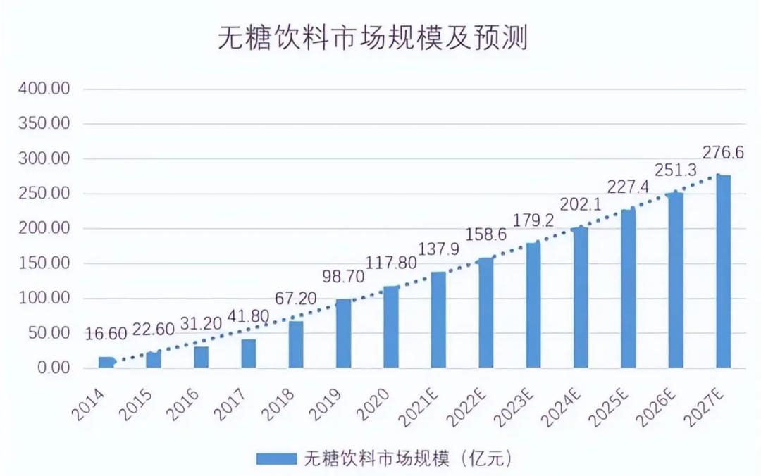这也给饮料市场带来巨大的影响——以元气森林为代表的“无糖”饮料快速崛起,市场预计到2027年,中国无糖饮料市场规模将达276.6亿元。