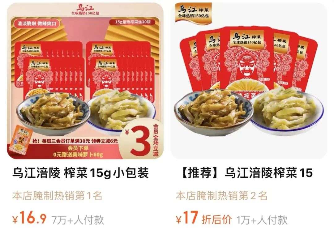 虽然近两年,乌江榨菜也在拓宽线上渠道,但是结合天猫超市的数据来看,乌江榨菜的月销量最高仅为7万+,与国民零食辣条等产品动辄10万+ 的月销量有明显差距。