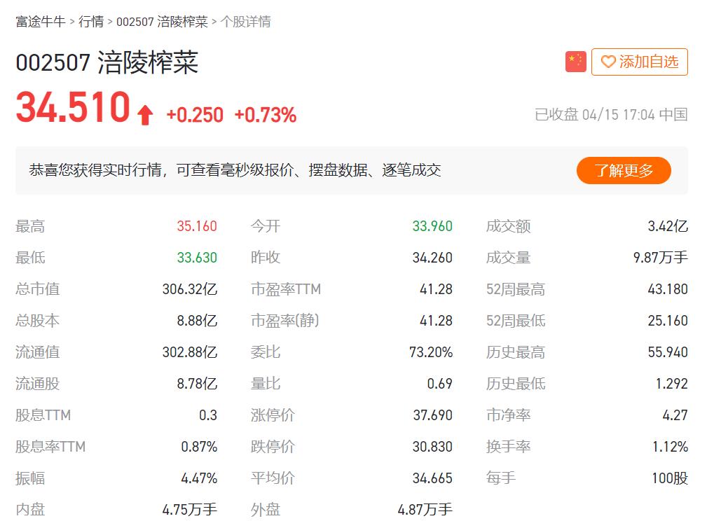这也让资本市场更加理性地看待乌江榨菜。2022年初,乌江榨菜的主体涪陵榨菜的股价一度冲至50.69元/股的高点,但是截止2022年4月14日收盘,其股价仅报收34.51 元/股,较高点下跌三成多。