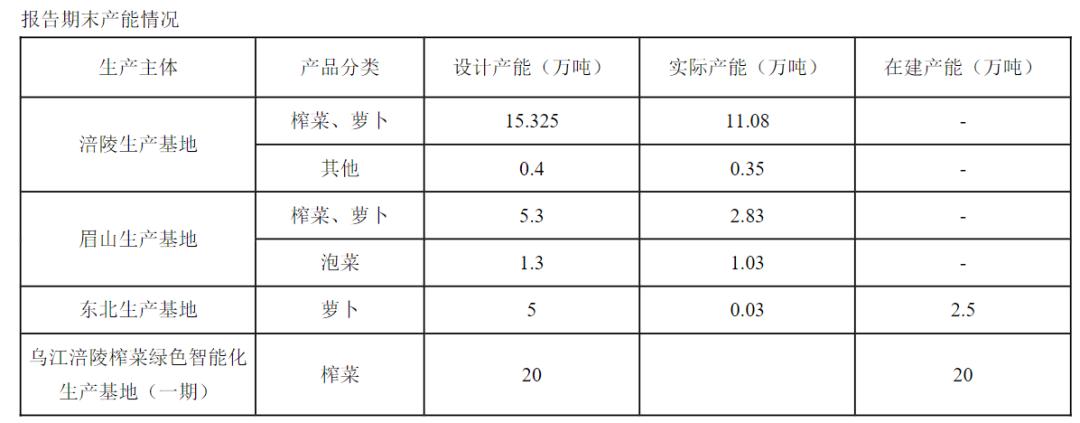 但结合前文不难发现,目前乌江榨菜已经供过于求。财报也展示了这一点,2021年,涪陵生产基地的理论产能为15.33万吨,实际产能仅为11.08万吨。实际产能比理论产能低了27.72%。