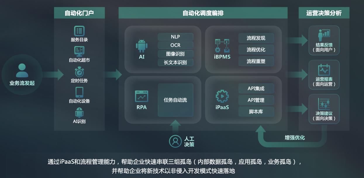 精鲲的特点也在于此。基于标准化的低代码iPaaS平台,客户进行简单配置,就能完成与任意系统/数据源的对接,建立多步骤的自动化工作流。此外,iPaaS平台还能对数据进行挖掘和算法分析,优化自动化服务,应用于不同行业和场景,解决了杂系统协作和重塑业务运营的痛点。