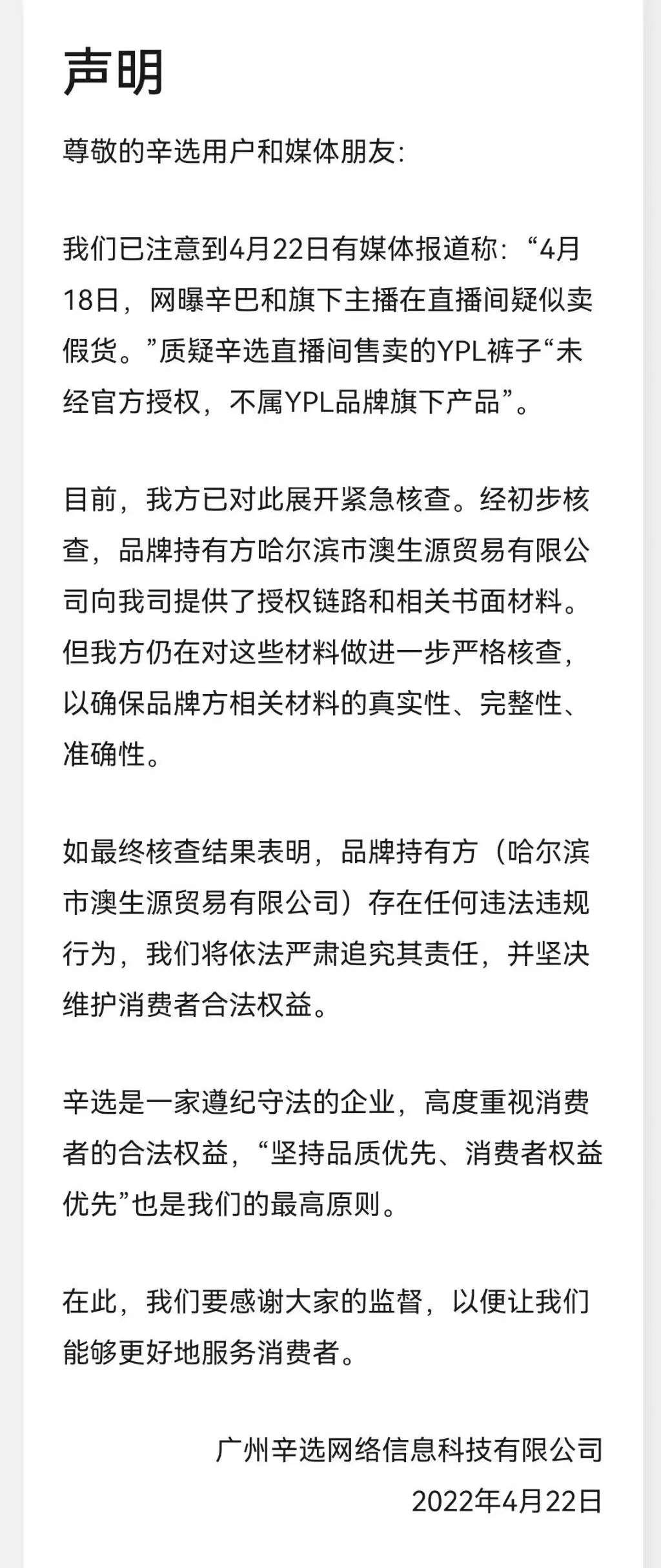 4月22日,辛巴售卖假货瑜伽裤一晚销售额超600万,引发热议。4月18日,辛巴和旗下主播“蛋蛋”在网络直播间,现身带货了一款名为“YPL防晒凉感裤”的产品。有消费者下单后发现YPL品牌官方并无这款产品,质疑辛巴售卖假货。4月22日,YPL运动潮品发布声明,经确认该商品未经官方授权,不属YPL品牌旗下产品。同时,品牌方证实辛巴售假索赔500万。辛选公司回应称:已展开紧急核查,品牌持有方提供了授权链路和相关书面材料。如最终查明品牌持有方违法违规,将依法追责。(封面新闻、辛选官方微博)