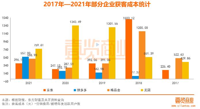 唯品会在2017年—2021年获客成本分别为:2017年522.63元、2018年1200.00元、2019年391.05元、2020年287.51元、2021年508.9元;