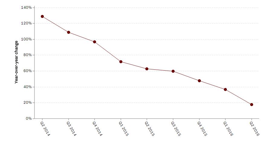 通过以下图表,可以看到Twitter公司的广告营收增长速度在过去几年当中一直不断下降。