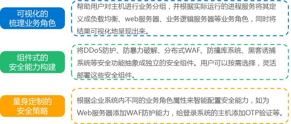 青藤帮助用户对主机进行业务分组,根据实际运行的进程服务将其定义成负载均衡、web服务器、数据库等业务角色,呈现可视化划分结果,并根据企业系统内不同的业务角色属性来智能配置安全能力。青藤还提供包括DDoS防护、防暴力破解、分布式WAF、防撞库系统、双因素认证系统(OTP)、黑客诱捕系统等功能在内的安全组件,用户按需选择,可以随时部署及撤销这些组件,青藤的后台系统会自动进行安装部署。