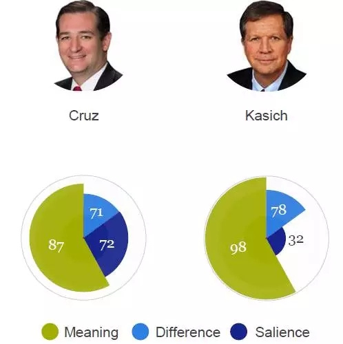 在“有意义的差别化”方面表现出色的品牌更有可能被消费者购买,能以更高的利润率售出,并更可能在未来增长。Kantar Millward Brown已经成功地用这一模型测量商业品牌的健康水平,而这次它被用来测量政治候选人在选民心目中的形象。这些政治人物是否在实质事情或是情感上与选民们建立了有意义的关联?人们是不是认为某一个候选人与其他人不同,更有能力让美国变得更好?另外,哪一个候选人是大家会首先想起来的?谁最有名?
