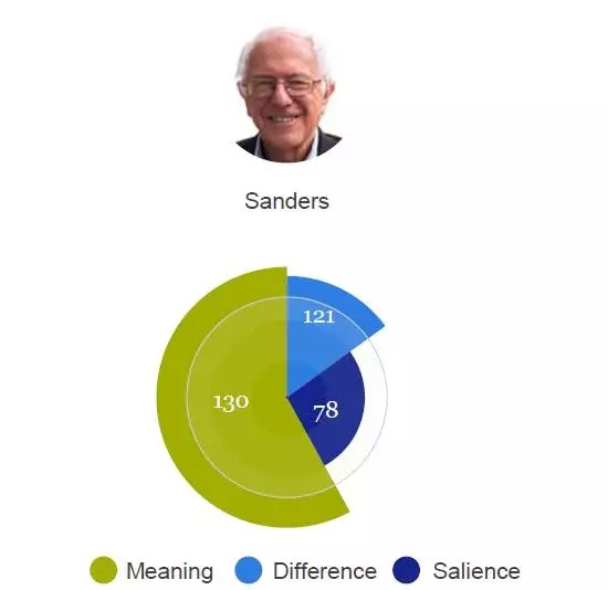 从4月份第一波调查的结果来看,民主党候选人伯尼·桑德斯在“有意义的”和“有差别的”方面表现非常出色,这两项的综合实力高于希拉里和特朗普。但问题是他的知名度得分太低,远低于另两人。整体来看,桑德斯的数据表现更像拥有增长潜力的品牌,例如捷蓝航空(JetBlue),Instagram和吉尔德利巧克力(Ghirardelli) – 了解这些品牌的人不多,但一旦熟悉了就会得到认同其价值观的消费者的全力支持,并且这样的品牌的受欢迎程度在不断增加。从这个角度来说,桑德斯没有能走到最后是因为他没有来得及让足够多的美国人了解他。