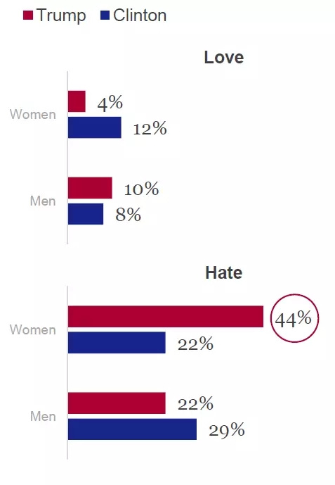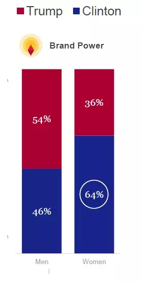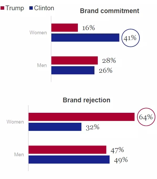 在2016年7月份,民主党与共和党各自确认了由希拉里对决特朗普之后,Kantar Millward Brown进行了第二波调查。受访者们被要求回答两个问题(这些问题常用来测试人们对品牌的支持和排斥,而这里则用来衡量对候选人的支持和排斥):