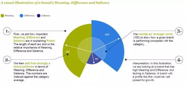 调研的模型是基于Kantar Millward Brown的“有意义的差别化模型”(Meaningfully Different framework),这一模型从(对受访者来说)“关联度”(meaning)、“差别化”(difference)和“知名度”(salience)三个维度测量商业品牌的健康程度。它的准确性已经被大量的销售数据和市场份额数据所证实。