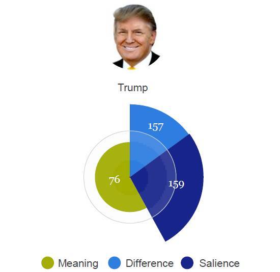 特朗普的调查结果显示他的团队采用了古老但是罕见的“特立独行”战略(category disassociation strategy),他在“差别化的”和“知名度”方面得分奇高,而“有意义的”方面分数很低。