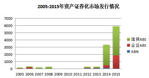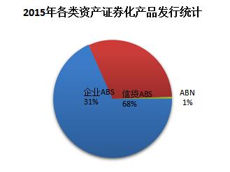 而在国内2015年,全国共发行1386只资产证券化产品,总金额5930.39亿元。主要分布如下图(ABN为资产支持票据)