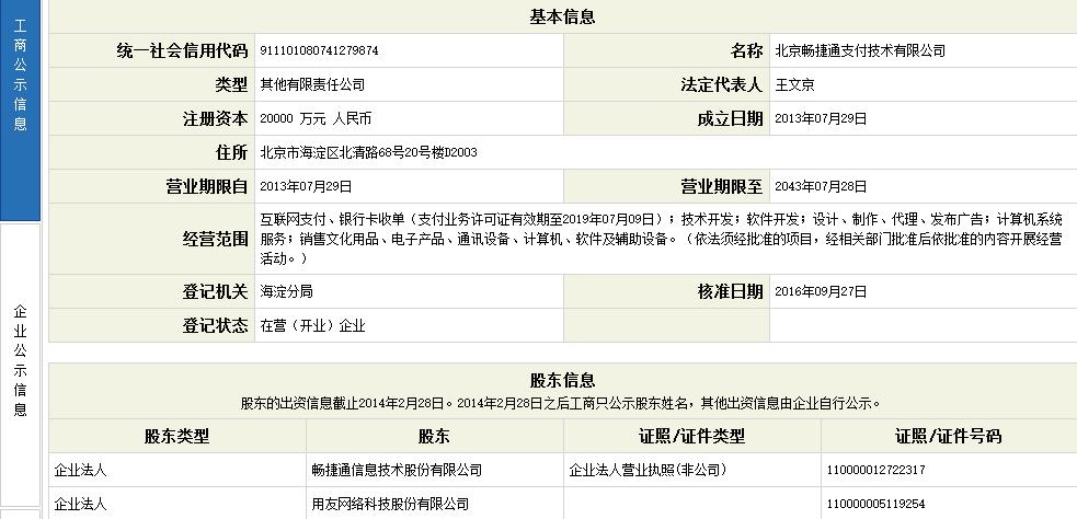 就支付业务而言,畅捷通支付已获得中国人民银行颁发的非金融机构《支付业务许可证》,有效期自2014年7月10日起至2019年7月9日止。