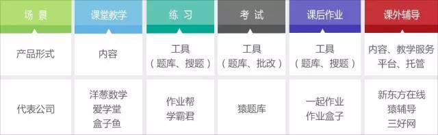 K12阶段涉及场景较多,例如课堂教学、练习、考试、课后作业以及课外辅导等。2011年起,各个场景不断有创新公司切入,相对应的,产品也是形式各异,例如:切入课堂教学环节的,主要是内容类产品;从练习和作业场景切入的,有搜题和题库类产品;面向考试的有题库和批改类产品;对于课外辅导,主要是提供教学服务和平台产品。