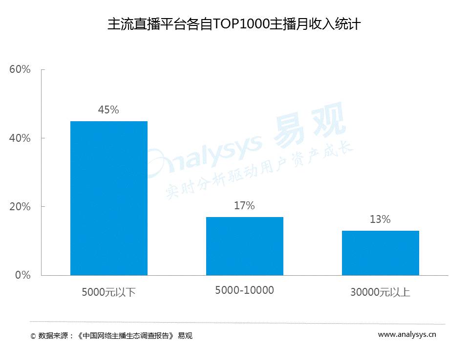 数据显示,只有在主流直播平台TOP1000主播中,只有13%的主播月收入能超过3万,大量的火红主播收入实际上非常低,45%的主播月收入在5000元以下。网红主播也形成了“赢家通吃”的局面,马太效应显现,排名前1%的主播收入占平台上所有主播收入的80%,排名前5%的主播收入占平台上所有主播收入的93%。