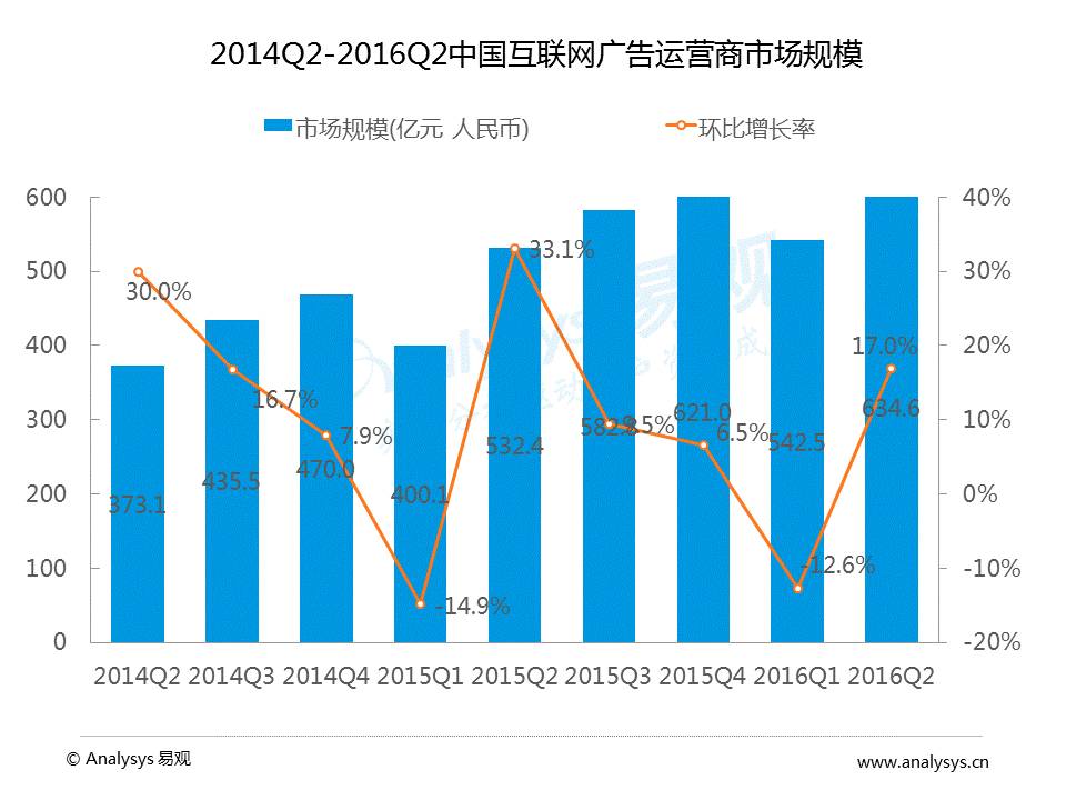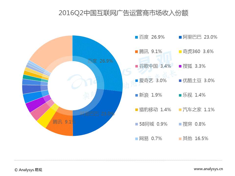 数据显示,2016H1中国互联网广告市场规模达1177亿元,其中Q2市场规模为634.6亿元,环比增长率为17%。2016Q2中国互联网市场收入份额中,BAT占据前三名,百度占据26.9%,阿里巴巴占据23%,腾讯占据9.1%。