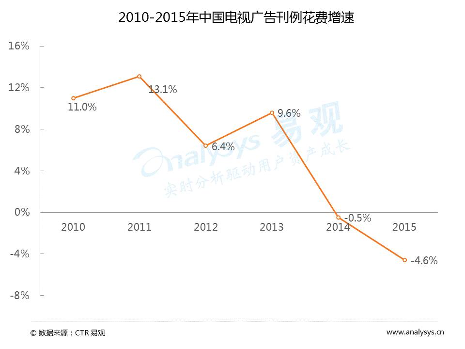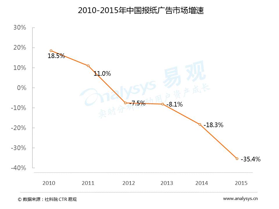 数据显示,2015年中国广告市场各渠道中,互联网广告占比超过一半达到55%,而传统媒体广告包括电视、报纸、广播和杂志占比总和为45%,可以看到,在互联网媒体的冲击下,传统媒体正在坠落。另外,从2015年各渠道市场增速来看,互联网广告市场规模增速高达36.1%,而传统媒体中,报纸市场规模增速为-35.4%,杂志为-19.8%,电视为-4.6%。