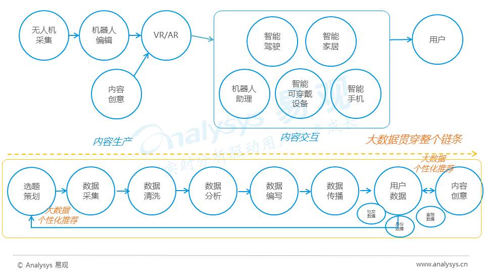 而大数据会贯穿整个链条,如无人机根据大数据预测进行采集,机器人根据大数据分析进行编辑,在所有的终端设备上通过大数据分析推送给用户。同样的,内容创造者也是通过大数据分析创造内容,通过相应的智能终端设备推送给用户。