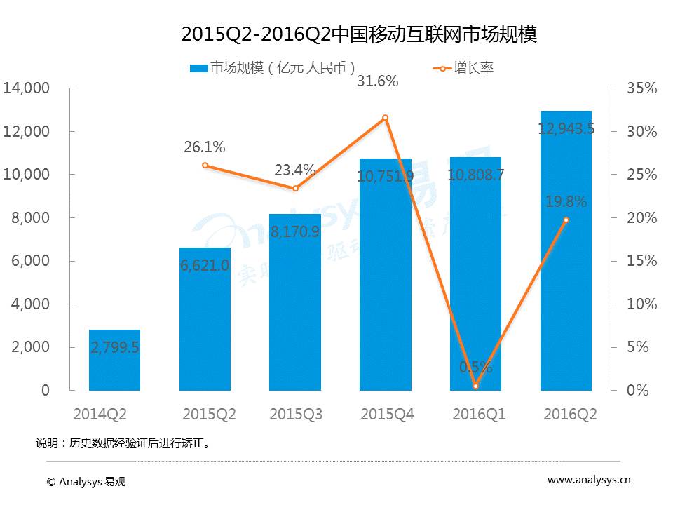 数据显示,2016Q2中国移动互联网市场用户规模为8.5亿,环比增长4.8%。2016Q2中国移动互联网市场规模为12943.5亿元,环比增长19.8%。