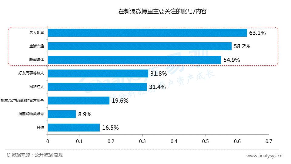 数据显示,在用户关注微信公众号的主要目的中,获取资讯这一目的占比最高,高达74.2%。另外,还有24.6%关注微信公众号是为了了解政务信息。而用户在新浪微博里主要关注的账号/内容是名人明星(63.1%)、生活兴趣(58.2%)和新闻媒体(54.9%)。名人明星除了关注他们本身的生活状态和兴趣外,主要还是热点新闻事件。